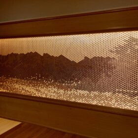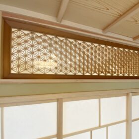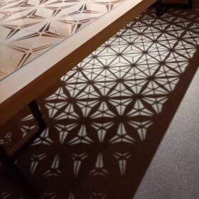 社内の建具や・照明・壁面に組子が一枚の絵の様に・・。