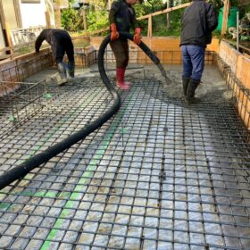 - 配筋の周りに木材や鋼材で型枠を設置し、生コンクリートを