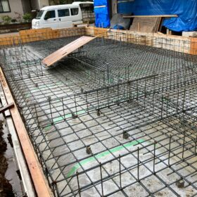 - 基礎の強度を左右する鉄筋を、設計図通りに組んでいきます。