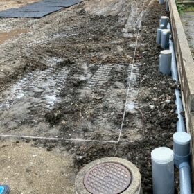 - 掘削した部分に砕石を敷き詰め、機械で締め固めて地盤を強くします。