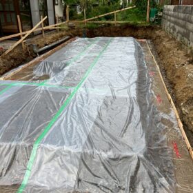 - 砕石の上に防湿シートを敷き、その上に「捨てコンクリート」と呼ばれる