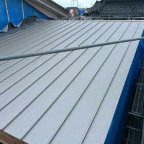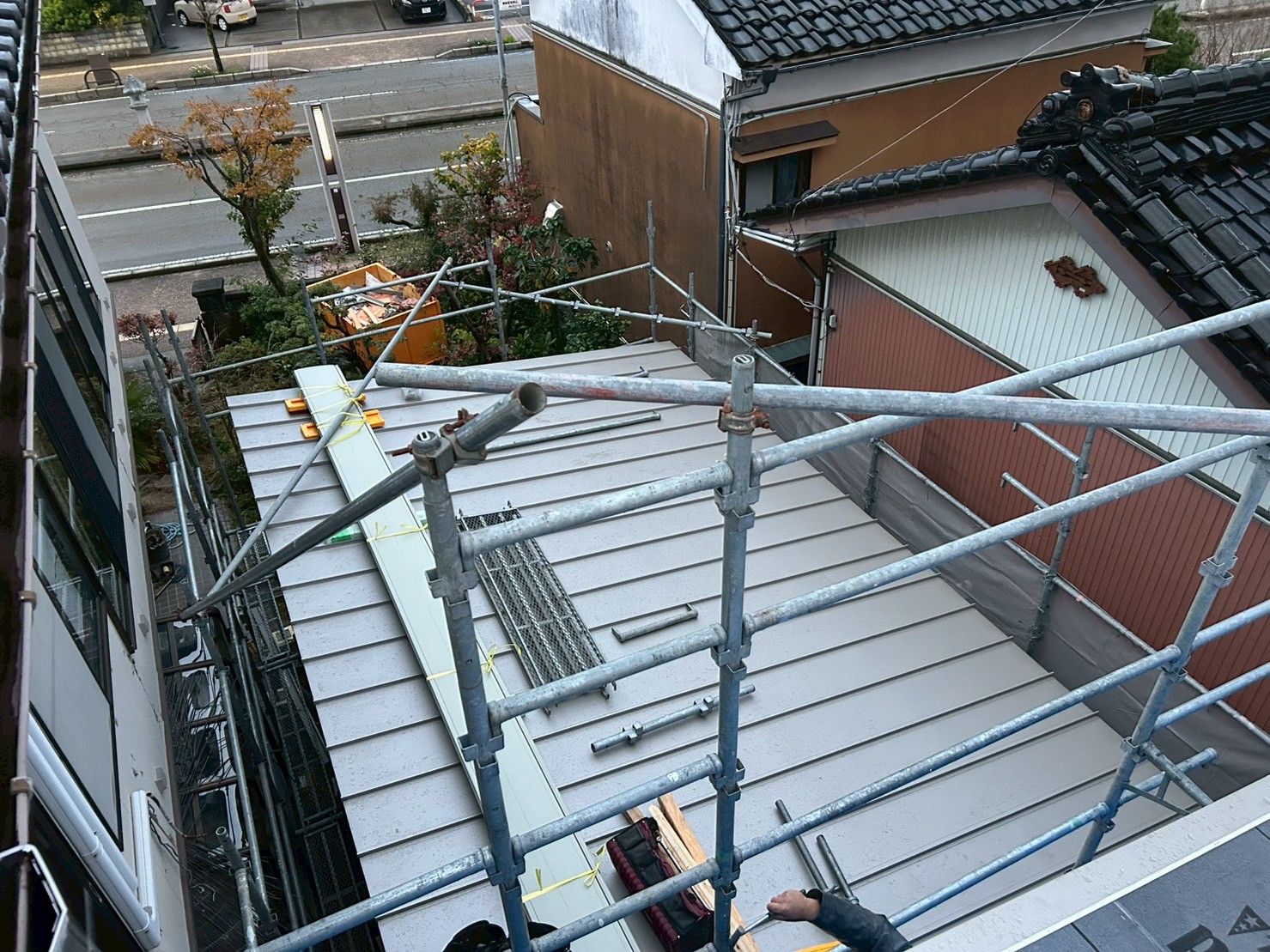 屋根材の葺き上げ中です。 屋根垂木の間に断熱材をはめ込み 上に構造用合板、吸音ボード、ルーフィング、 ガルバリウム鋼板の順に貼りあげて行きます。